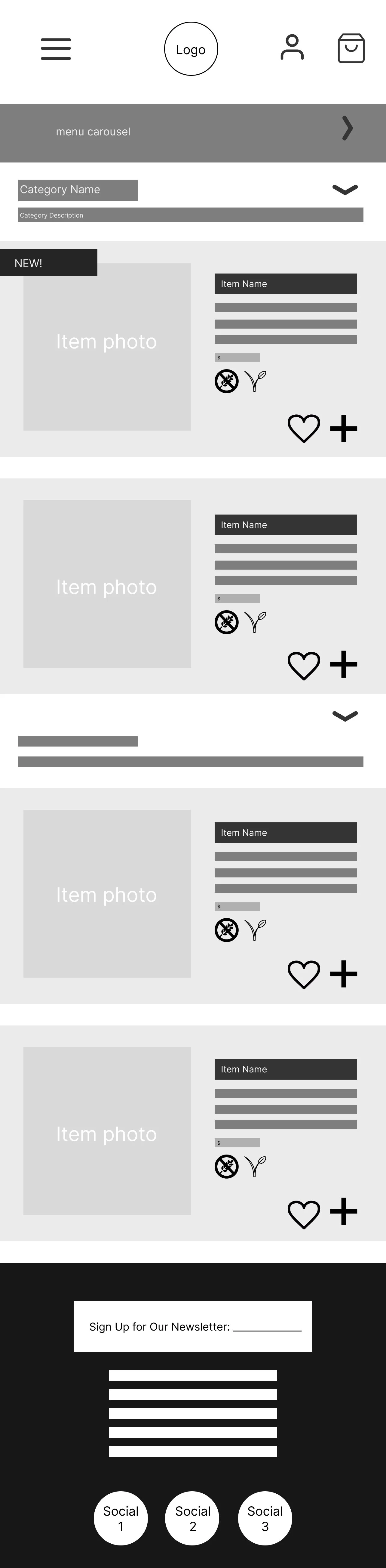 Allows users to see and browse menu items quickly. Users can scroll through the categories; The selected type is indicated with the darkest green.